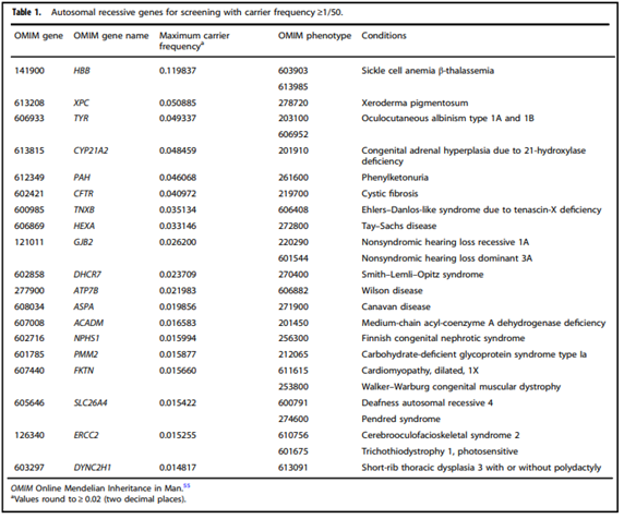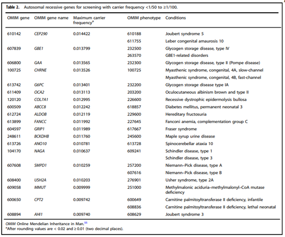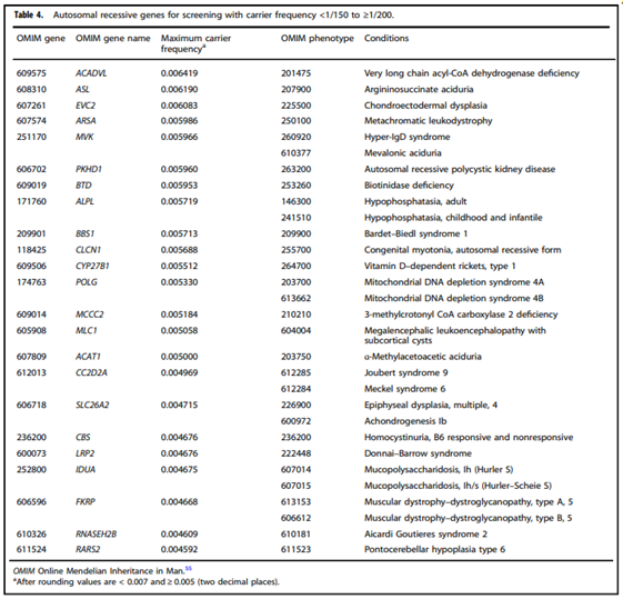 - “All pregnant patients and those planning a pregnancy should be offered Tier 3 carrier screening for autosomal recessive (Tables 1 – 5) and X-linked (Table 6) conditions.”